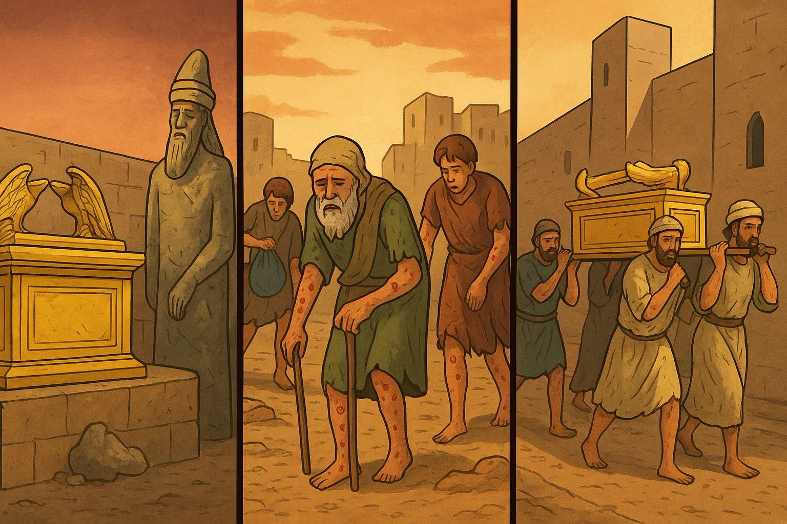 Și totul începe când pe fii lui Eli i-a mâncat în cur să fie curvari și Dumnezeu îi pedepsește printr-un război cu filistenii (vezi primele 4 capitole din 1 Regi). Filistenii îi bat pe israeliți și i-au cu ei Chivotul Legământului – adică prototipul raclei ortodoxe, doar că versiunea „early bird”, cu vreo 3000 de ani înainte să devină „adevărata credință”. Îl duc la Așdod și îl parchează lângă zeul lor, Dagon (1 Regi 5:1-2).