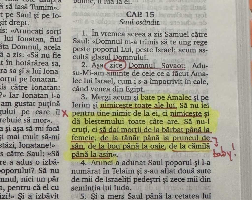 Cu alte cuvinte, un ordin de nimicire totală, fără milă, nu doar pentru soldați, ci inclusiv pentru copii și bebeluși. Și da, e în Biblia ta. Uite negru pe alb: